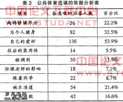 从表3中可以看到。我校学生参加公体选课的依据呈多样化的趋势。