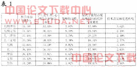 从总体看来,确定教学媒体类型所要考虑的因素排序是:学生的生理、心理特点和知识水平(35.86%),教学内容的特点(34.28%),取决于使用该媒体所付出的代价与效果比(19.13%),教师的习惯(7.82%),技术含量和先进程度(2.91%)。然而不同学科类别的学生确定教学媒体的所考虑的因素排序有所不同,即大四理科和大三理科的因素排序一致,大四文科和大三文科的因素排序~致。二者最大的区别在于理科首先考虑的因素是教学内容的特点,而文科首先考虑的因素是学生的生理、心理特点和知识水平。
