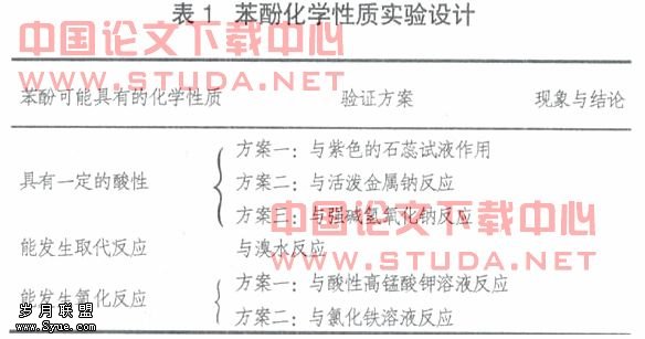 例如,在进行苯酚的化学性质的探究中,我们可以先让学生结合苯酚的结构特点,预测苯酚可能具有的化学性质:具有一定的酸性(羟基中的氧氢键可以断裂,苯环是吸基团);能发生取代反应(分子组成中有苯环);能发生氧化反应(羟基可以被氧化)。然后,教师引导学生积极思考,联系所学实验,设计出具体可行的实验方案(如表1所示)。最后,组织学生根据设计方案,实施实验。这样,通过对醇和苯的化学性质的复习,结合苯酚的结构特点,引导学生对苯酚的化学性质做出预测。并通过实验探究不仅使学生掌握了苯酚的化学性质,同时也有利于提高学生的观察能力和动手能力。