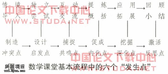 “怎样促进有效教学的发生”是当前界的热点话题。学生数学认知的“发生”和“形成”具有一定的性,要使数学教学有效,教师首先要遵循这些规律,使教学流程的推进与学生认知活动的展开合拍共振。如何才能达到合拍共振呢?关键是教师要找准每个教学流程中起核心作用的“发生点”,将这些核心点做深做透,从而最大程度地促进有效教学的发生。从数学课堂的基本流程视角出发,图1中的六个“发生点”数学教师要用心捕捉、倾心着力。