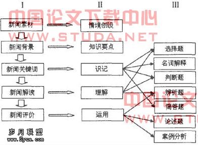 II是教学目标模块,这是一个虚拟模块,在课程网页上没有相应的实际内容,包括情境创设、知识要点、识记、理解和运用5个子模块,与I的5个子模块一一对应,与III的子模块息息相关。它既是是教师在创设新闻情境时的教学目标,也是要求学生达到的学习目标。