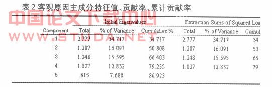根据对客观原因测量指标相关系数矩阵分析显示,拟定的各测量指标既有独立性,又有关联性。经检验,KMO值为0.633,说明原始数据可以采用因素分析法进行研究。经Bartlett检验,卡方统计量为657.296,自由度为28,P﹤0.001。适合采用主成分分析对湖南高校中年教师体育锻炼的客观原因作进一步的探讨。