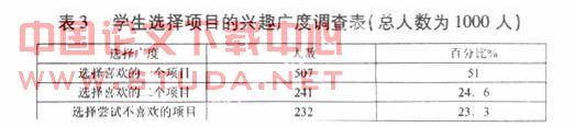 3.5在分项教学过程中,两年或者整个职业中学段都上同一个内容,时间跨度太长,教师在安排教学内容上捉襟见肘。在整个职业中学的体育教学过程中,分项选修学生只会选择一、两个内容,时间的跨度太大。经学生调查表明:有32%的学生认为设置的时间太长,到后来觉得没有什么可以学习,在跟部分老师的交谈中,部分教师认为单一的一个内容设置的时间太长,在教学内容的安排上捉襟见肘,到一定时候会觉得枯燥,学生失去了上课的新鲜感,教师失去了上课的激情!