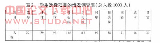 3.2在教学过程中由于学生选项比教广泛,师资有限,导致课程冲撞的现状。调查表明:在课程设置当中,由于学生的选项比较广泛,所以在设置的项目中,有两个项目甚至要在同一课中完成,就是有一半的学生活动,一半在上课,轮流交换,不仅教学课时不足,对课的质量有很大的影响,对教学本身又增加难度,同一个班级要备两个内容的教案。跟学生访谈,有得学生甚至一个学期没有上过几节课,自己偷偷到别处活动,没有在上课的学生称自己是“游荡军团”,很大的弊端就是教学秩序比较混乱,学生不容易管理。(表2) 3.3在教学过程中出现每个班人数差异较大,每个老师的上课难易程度不一。根据按项目分班现状表明:由于学生的喜好项目较多,选项广度较大,因此在教学分班过程中,出现了上课学生人数差异较大,有的项目报名学生有20名,有的是40名,相差近一半,这样不仅增加上课难度,另外在教师之间或多或少出现不和谐的因素。