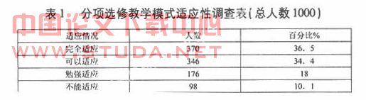 3.1通过体育分项教学发现学生体育能力的薄弱,学生之间的差异较大。经过与教师和部分学生访谈表明:学生在体育分项教学过程中,有28%的学生对体育分项教学不能很好的适应,由于一年级的学生来自全区的各个初中,每个初中学校的教学设施、教学模式不尽相同,加之学生自身素质的差异,导致在一开始分项选修教学中,学生表现出来的体育能力不尽相同,城区好于乡镇。由于学生刚迈进职业中学的大门,对职业中学体育的教学模式肯定要有一个适应的过程,而分项选修让学生一进入职业中学就学习单一的有难度技术的动作,体育能力较差的学生无从下手,很不适应,跟不上上课的节奏。学生没有打好基础,这一步跨得有点过大。(表1)