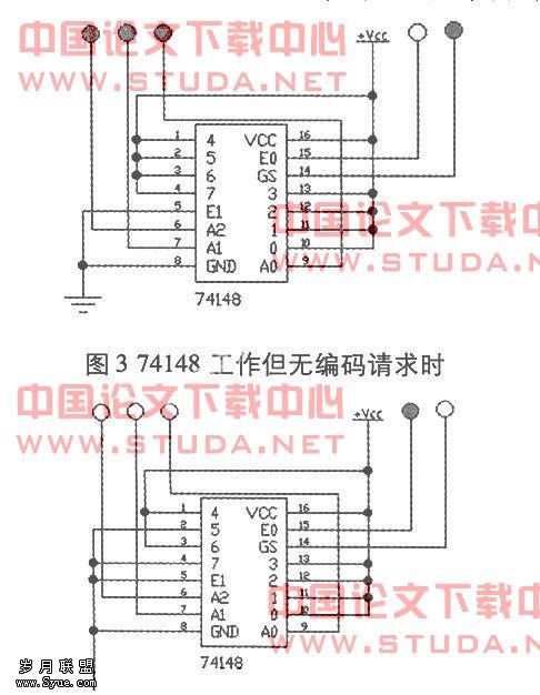在讲授优先编码器内容时,根据优先编码器的原理,我们设计了一个8线-3线优先编码器,它具有8个低电平输入有效的编码输入端和1个低电平有效的编码器片选信号。输出为3位二进制反码。电路设计出来我们需要了解其效果,以验证电路是符合我们的真值表的。在EWB的库中,74148是一个根据我们的设计思路实现的8线-3线优编码器,其功能表与我们的真值表完全一致,所以用74148代替我们设计的电路,连线后利用高电平有效的红色探测器演示输出信号的高低电平情况,发现当片选信号为低电平并且所有的输入编码请求都无效时,显示输出编码结果三盏灯全亮,说明输出编码结果为“111”,如图3所示;当片选信号为低电平并且输入编码端7有效时,不论其它输入编码端是否有效,显示输出编码结果的三盏灯全灭,说明输出编码结果均为“000”,如图4所示,与真值表一致。