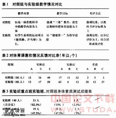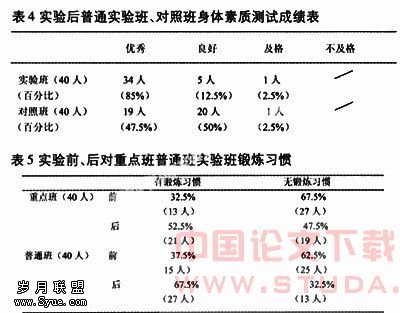 问卷调查法:对重点班和普通班学生体育锻炼习惯、次数、持续时间、内容、场所及锻炼形式进行实验前、后的调查。