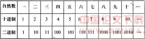 二进制是基数最小的一种记数法,十进制中要用10个数码:0、1、2、3……9,而二进制只用0和1两个符号,0仍表示零,1仍代表“一”。但是“二”以后就没有单独数码代表,所以要“逢二进一”,每满足“二”就进上一位,由此类推,就可以表示所有自然数了。例如下表: