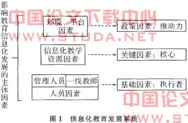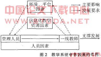 在信息化教育发展系统中,人员因素是最基础的因素,他们是教育信息化的执行者,人员中包括管理人员和一线教师。除了人员的因素,系统的发展还需要建立相应的教育硬件资源和软件资源,其中软件资源在发展过程中起着关键作用。此外,建立符合学校实际情况、利于教师开展信息化教育的政策环境和技术支撑平台是推动教育信息化快速发展的推动力。