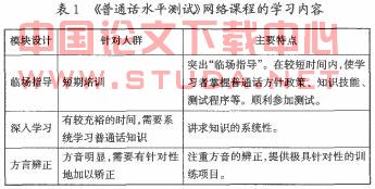 在课程编制过程中,我们根据学习者的认知特点,特别注意了课程内容的组织安排,设计了临场指导、深入学习和方言辨正三大模块。同时,在教学内容的呈现上,发挥了多媒体的优势,全程配音,创设图、文、声并茂的学习情境,让学习者通过多种感官进行高效率的学习。在学习资源的安排上,建立多种资源库,收集了针对各个不同层次学习者的学习资料,设置学习助理“小普”提供多方位导航,辅助学习者搜索开放的学习资源。此外,设置了课程讨论区,帮助学习者协作学习。通过评估反馈系统,学习者可以不断检验自己的学习情况,通过自我分析,达到对知识的全面理解。整个课程体系的每一部分都相互联系、相互作用有益于学习者通过学习形成对普通话知识的意义建构。 1.“普通话水平测试”课程的学习内容。该课程由临场指导、深入学习、方言辨正三个部分组成,所选择的内容都是按照最新《普通话水平测试纲要》来确定的,在一定程度上满足了不同层次学习者的需求(如表1)。