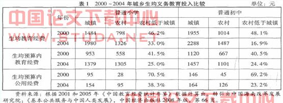 大批农村贫困地区的儿童因家庭经济困难而不能正常入学或中途退学,一些农村地区失学率和辍学率长期居高不下。农村义务教育在教育经费、办学条件、师资力量上与城市都存在着巨大的差距。比如,2002年全社会的各项教育投资是5800多亿元,其中用在城市的占77%,占总人数60%以上的农村人口只获得23%的教育投资。长此以往,将会使城乡差距更加拉大。近年来,经过各级政府的努力,特别是中央政府的有利政策和积极推动,义务教育城乡生均教育经费、生均预算内教育经费、生均预算内公用经费之间的差距显著减小。(见表1)但就总体而言,城乡教育均衡发展仍然任重道远。国家对城乡的公共投入,实际上是起了一种社会再分配的作用。而作为公共投入的一种,重视农村义务教育,加大对农村义务教育的投入,事关农村教育落后状况的改变,城乡差距的缩小,社会公正的维护。