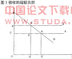 定量分析是运用数理模型或量化工具说明事物的发展规律。相对定性分析而言,定量分析一般具有准确性和简洁性。在现实中,公共欲望和个人欲望同时存在,但在一定时期内,用于生产或提供公共产品和个人产品的资源是一定的,并且生产或提供公共产品本身也存在效率问题。因而,公共财政学课程就必然涉及两个问题:第一、如何在公共部门经济与私人部门经济之间分配资源;第二、如何在生产或提供公各种共产品之间分配资源。针对这两个问题,运用定量分析方法,既能提升公共财政学课程的理论水准,又会加强学生的理解力。详见以下两例。 图3是针对税收对微观活动的效率损失应当最小(即尽量减少税收)的定量分析方法。税收直接减少了纳税人所拥有的收入和财产数量,直接减少了和个人从事经济活动的资源,同时还可能扭曲市场活动主体的经济行为。这些都造成了效率损失。这种效率损失,就是所谓的税收的“超额负担”(excessburden)①,这是政府课税所可能给纳税人带来的超过实际纳税金额的损失。这些损失是平自无故的,纳税人和政府都无法获得,似乎是从整个社会中“蒸发”了。因此,它被称为税收的“超额负担”。如图3所示,S是课税之前的供给曲线,D为需求曲线,E为市场均衡点,最初的消费者剩余为三角形ACE;课税之后,供给曲线为s/,新均衡点为E/,消费者剩余为三角形ABE/;新消费者剩余比初始的少了梯形面积BCEE/,其中的矩形面积BCDE/代表的剩余为税收,但三角形DEE/面积所代表的剩余谁也没有获得,即为超额负担。