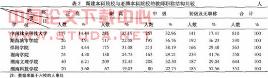 从表 2可以得知,五所新建本科院校的教师职称结构与老牌本科学校相比,具有高级职称的教师比例较小,如湖南城市学院、湘南学院和湖南科技学院具有副高以上职称的教师所占的比例分别是26.99%、28.77%和 24.71%,与教育部本科教学评估体系规定:合格的本科院校副高职称以上要达到35%以上的标准 J,还有较大的差距;尤其是高级正职的比例相差较大,中南林业科技大学具有正高职称的教师占 14.44%,而五所新建本科院校具有正高职称的教师所占比例都不到 7%,其中湖南城市学院、邵阳学院和湘南学院都低于 5%。