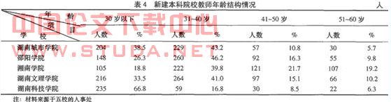 按照教师的成长,教师队伍的正常年龄段分布,以每十年为一档,每个年龄段的应占教师总数的 25%左右为宜。从表 4可以看出,五所新建本科院校教师年龄结构分布不均匀,40岁以下的青年教师居多,将近到达专任教师总数的70%以上,中年教师很缺乏,其比例不到专任教师的30%,而湖南科技学院尤为突出,40岁以下的教师占教师总数的 83.6%,教师的年龄结构严重失调。