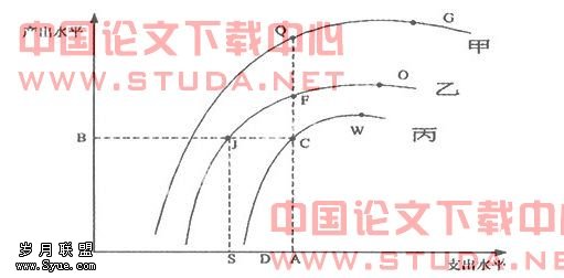 在此对教育效率与公平关系的考察,主要针对资源配置效率与公平的。公平还是区分机会公平和结果公平。通过下图对教育公平和效率关系做一简单探讨。从效率的角度而言,如果三个学校的基础条件是不同的话,就要要求根据学校的边际生产率进行投入。如下图,横轴表示教育支出水平,纵轴表示教育产出,甲、乙、丙表示三个不同的学校(甲>乙>丙),分别在G、O、W点达到最高发展水平。