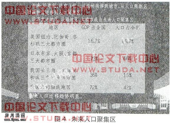 这意味着未来30年间,将有3亿人从转移到城市,从人口限制区、人口疏散区迁移到人口聚集区。发达地区、沿海地区、大城市成为未来人口聚集区。现在我们的还没有准备好迎接这样的人口大迁移。世界著名的几大都市圈,美国的纽约、芝加哥、洛杉矶三大都市圈,GDP占全国16.7%,人口也占全国16.7%,就是人口和经济总量基本是均衡的。日本东京、大阪、京都三大都市圈,经济总量占全国73%,人口占全国68%。而我国长三角、京津冀和珠三角三大都市圈,经济总量占全国36%,人口占全国15%,我国沿海轴线地区,经济总量占全国的72%,而人口占全国的42%。这些数字说明未来的人口趋势向经济发达地区聚居是不以人的意志为转移的。我们要准备迎接这样的转折。(如图4所示)