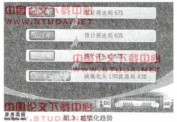 另一方面是城镇化的变化。1985-2005年我们城镇化水平从19%提高到43%,2014年预测将达到50%,到2023年,中国预测将达到60%,2030年,预测将达到67%。(如图3所示)