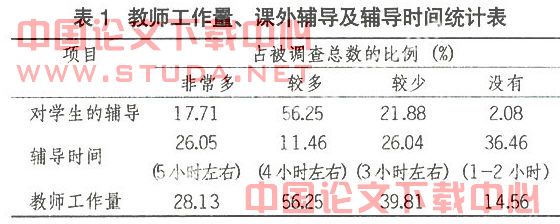 布置课外作业和辅导,是课堂教学的继续与补充,有助于巩固课堂和检验书本知识,有利于因材施教。调查显示:有2.08%的教师对学生放任自流,从来不辅导学生;一周辅导学生1-2小时的占教师总数的36.46%;有84.38%的教师感到新课改加重了他们的工作负担。如表1。
