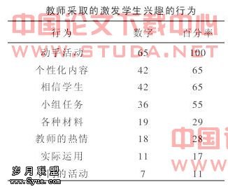 在教学组织中吸纳学生的参与。美国一位研究者对65位中小学教师进行了调查,统计其使用的激发学生兴趣的方法,发现100%的教师使用过“动手活动”。