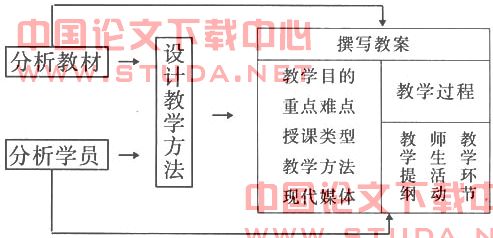 通常来说,撰写教案是一个复杂的过程,它起始于分析教材、分析学员、设计教法等一系列细致复杂的工作,是由众多的环节组成(见下图)。