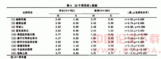 第三,学生和教师对教学质量优秀教师素质特征的评价在10个项目上存在显著性差异(见表4),但是在总体评价上基本一致。