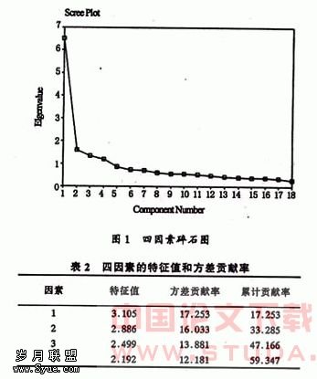 (1)因素数目的确定。调查问卷中,涉及到23项教学质量优秀教师素质特征项目,通过总体特征统计分析发现,最后5项内容并不是区分教学质量优秀教师与绩差教师的重要因素,不仅均数低(M<3.45),而且评价者的分歧也较大(S>1.05)。通过与有关专家讨论,决定剔除最后5项指标,对前18项内容进行因素分析。本着化繁为简原则,采用主成分分析法抽取因素,从碎石图<图1)可以发现,特征值在第4个因素以后开始形成碎石,且特征值大于1的因素为4个,因而决定抽取4个因素。4个因素的特征值和方差贡献率见表2。