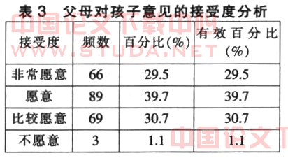 调查显示(见表3),有77%的学生表示当自己的父母与他们的观点出现分歧时或生活中遇到什么不懂的问题时,他们愿意向自己的父母耐心的解释或与父母商讨,而大部分的父母也能接受孩子的意见。家庭教育过程中的相互学习,一方面有利于农村父母自身文化素质的提高,另一方面也有利于父母与子女之间的沟通。