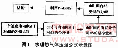 (1)解决问题的理论基础。伯努力对气体压强的微观解释。(2)研究方法。对单个气体分子用牛顿力学,对大量气体分子运用统计力学规律。(3)研究思路。图1所示思路。(4)所用理论和公式。完全弹性碰撞,作用于反作用,统计平均。(5)选取什么作为研究对象?全部器壁?还是一小部分器壁?结论是否一样?(6)分别求出一个速度为vi的分子对dS的冲量△Ii,dt时间内vi的分子对dS的合冲量dIi,dt时间内所有分子对dS的总冲量dI。求出压强P的表达式。(7)运用统计平均化简。(8)对压强公式分析讨论。