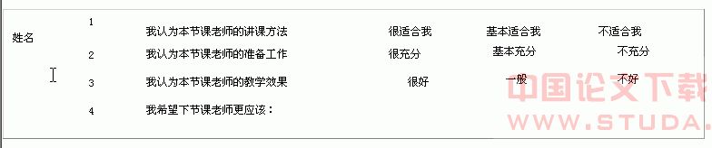 4、鼓励学生对教师的课堂教学进行评价。课堂教学是师生之间的互动过程,让学生对教师每节课的教学情况进行评价。即提高了学生的听课效率,又缩短了师生之间的距离,更主要的是让教师能够及时了解到每个学生的专注情况,获得更多的反馈,以便使教师针对每个学生的具体情况在备课时作出调整,提高教学效率。因此,我在每节课后要求学生用以下方式对老师的教学进行评价。