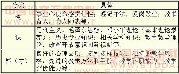 教改的成败取决于教师素质的优劣。符合21世纪时代要求的历史教师的素质有哪些?行动纲领提出了五个“具备”;具备科学的唯物主义历史观和方法论;具备与素质教育相适应的教育观念和积极向上的人文精神;具备崇高的爱岗敬业精神;具备较深厚的知识涵养;具备融多种教育技术手段为一体,并有自己独特教学风格的教学能力。综观《教师法》、《师德修养》、历史教育教学法、教育心以及历史学科行动纲领等政策法令、专业论著、研究报告等,我们认为,新世纪中学历史教师必须具备的素质可归纳为“又红又专,多才多能”八个字,又可概括为“德、识、能”三个方面的具体目标和要求,列表如下: