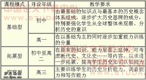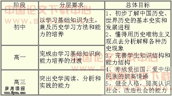 重构知识体系的目的是为了达到中学历史学科素质教育的总体目标和初高中不同层次学生的不同的学习要求,详见下表所示: