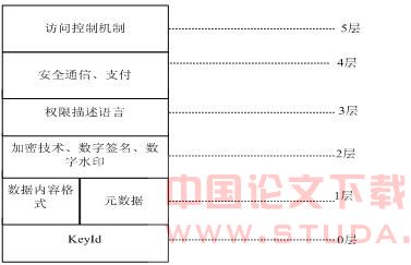 从技术的角度来看,DRM由一系列相互联系、相互渗透的技术组成。按照网络OSI模型分层的思想,我们用分层的模型表示DRM的技术构成。如图1所示。3.1 KeyId