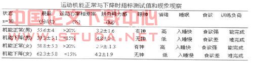 3. 晨脉、运动心率、肌肉用力感在机能正常时与下降时其指标值有显著差异,眼神、睡眠、食欲等现象观察也是判断运动机能的有效方法。