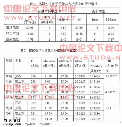 初测结果显示、高职学院学生存在较为严重的学习倦怠感,其中成就感低的得分最高,其次是情绪低落和行为不当。在“情绪低落因子上的得分高于本科院校学生”这一点上和任怡在《大学生学习倦怠量表在高职院校的试测》中试测到的“高职院校学生在情绪低落因子上的得分略低于本科院校学生”的结论不同。可以认为这与高职院校所处地区以及各高职院校的具体情况相关。社会上普遍认为到发达省份读大学更好就业,机会更多,因而表现得情绪较好,而认为到中西部省份尤其是小城市的高职院校读书就业难机会少,因此显得情绪低落。而且目前各高职院校情况参差不齐,校园建设、师资力量、硬件设施、就业率等都会影响学生的学习情绪。,