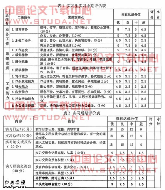 高职文秘综合实习是学生就业上岗的前奏, 通过实习、接触社会,使学生受到深刻的专业思想,同时将所学的文秘基础理论、基本知识和基本技能,综合运用于社会实践,对确保学生的培养规格方面具有特殊的功能,它确实是文秘专业实践教学体系中极其重要和不可替代的环节。由于开放式的校外实习方式,也便带来了很难对学生的实习成绩做出客观、公正和有效评价的问题。如何走出实习成绩难以评定的困境,我认为应在实习的不同阶段围绕文秘人员培养的目标、针对阶段特点做好必要的评估,建立、完善的评价体系。体系中每一个环节的评价不仅可以科学、公正地评价实习生的实习效果,而且又能起到引导实习生明确实习方向、实现实习质量的监控的作用。