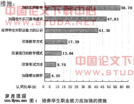 高职生与普通高校本科生相比,其优势在于高职生具有较强的实践能力。但据我们对46个单位调查,有58.70%的单位认为要加强实践教学,41.30%的单位认为要培养学生对职业能力的认识,47.83%的单位认为要加强校外实习基地建设,这三个方面措施都与学生的动手能力密切相关,这说明目前培养的高职农业技术类生尚无法较快地适应社会和企业对高级技术应用型专门人才的需求(图4)。