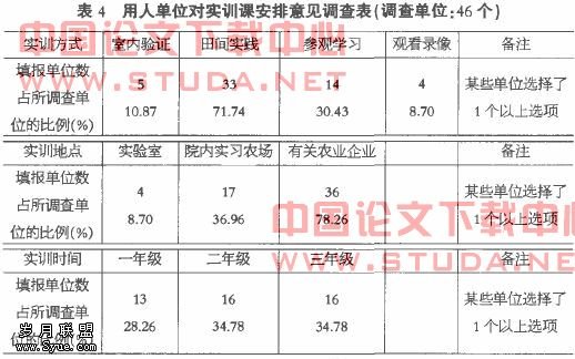 如何提高高职毕业生的技能水平,从而使毕业生能更快地适应用人单位的要求,我们就目前学生实训课的方式、地点和时间的安排等问题向用人单位作了一个初步的调查,进一步明确了今后实训课程的安排(表4)。