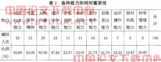 员工能力主要表现在适应社会能力、吃苦耐劳精神、人际沟通能力、团队协作能力、开拓创新能力、知识获取能力、参与竞争能力、思维表达能力、动手操作能力、面对失败能力、管理能力等11个方面。在调查时,我们要求每个用人单位对员工应该具备的能力进行排序,每个被调查单位最多可选填4项自己认为最重要的能力。结果表明:近一半的用人单位更看重的是员工的适应社会能力、吃苦耐劳精神、人际沟通能力和团队协作能力(表3),