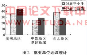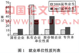 通过对毕业生就业单位性质对比,如图1所示。从图1可以看出:环境专业就业单位的主体发生了一定的改变,从集中于私有制向股份制企业转移,同时作为前几年的就业主体之一的国有企业的需求也有了一定程度的增加。从各类型企业的分布不难看出各类企业呈良性分布,这反映出环境专业的市场需求在经过前几年的萎缩后开始出现明显的返弹。