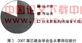 通过对2007级已签约毕业生在企业中所从事岗位的分析,可以看出从事环境工程技术类工作的占一半以上,其次为市场销售类,还有技术管理类(包括储备干部),具体见图3。从图3中的结果并比较往年毕业生就业情况来看,专业对口率明显提高,这也与1.4.1相符合。毕业生所从事的岗位以技术类为主体,其次为市场销售类,同时今年出现明显的特点在于对技术管理类(包括储备干部)的需求开始增加这就对毕业生的技术管理技能提出了新的要求。