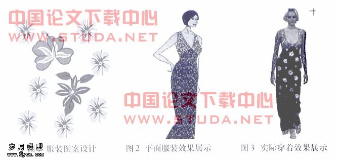 (1)读入已绘制好的矢量图;(2)选择色彩,单击改变背景色彩;(3)选择层次设定,新开一个位图层次,并将矢量层与位图层合并;(4)运用填色指令的单色填入,在图案的各部分,进行颜色的填入。在蕾丝区内,此时填入的是底色。(5)在读入/储存中,读入一幅同样的矢量时装效果图,并将其转换成位图,两幅图应完全重合;(6)选择图案填入,在读入/储存中,读入蕾丝图案;(7)选择填色中的图案填入,将蕾丝填入指定区域,设计者也可以根据自己的需要,选择不同的填入方式。(旋转填入、跳阶填入等等);(8)随后,再填入裙身部的蕾丝。 4 立体服装效果展示