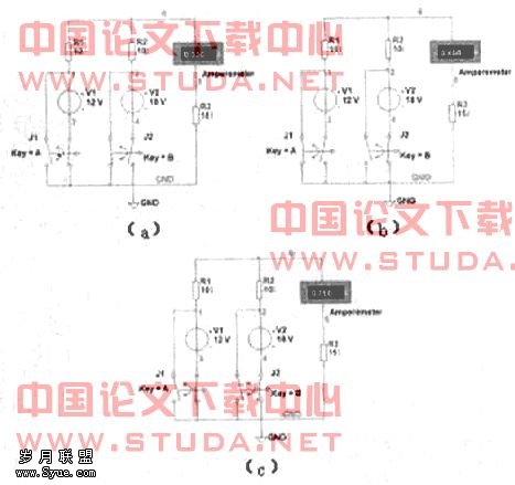 如图所示电路,两个电压源V1、V2和电阻R1、R2、R3构成复杂电路,两个开关J1和J2用于控制这两个电压源是否起作用,首先按A键使电压源V1起作用,而V2则不接入电路用导线替代,相当于电压源V1单独作用,如(a)图所示,此时测得电流表示数为0.300A,同样使电压源V2单独作用,如(b)图所示,测得电流表示数为0.450A,然后再让两个电压源均起作用,如(c)图所示,测得电流表示数为0.750A。显然0.750A=0.300A+0.450A,故验证了叠加定理。