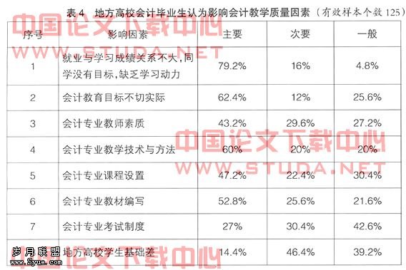 影响会计教学质量的因素是多方面的,但较多的毕业生认为“就业与学习成绩关系不大,同学没有目标,缺乏学习动力”和“会计教育目标不切实际”是两个最主要因素,特别是就业形势的严峻和一些不公平现象,使学生曾经产生了新的读书无用论。此外,会计教育目标“培养高层次的高级会计人才”与就业现实差距过大,也对会计专业学生产生了较大冲击;处于就业压力和工作需要,会计专业学生希望会计专业教学技术与方法更有用,教材编写和课程设置更切合实际,也希望会计专业教师素质能更高。当然,学生也承认地方高校学生基础相对较差对学习有影响。