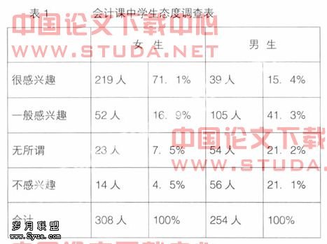 从表1中不难看出学生对会计课的态度,分别对男生和女生进行分析,女生有71.1%的人对会计课很感兴趣,而男生只有15.4%对会计课感兴趣;对会计课一般感兴趣的女生有16.9%,男生有41.3%;对会计课无所谓的女生有7.5%,男生有21.2%;对会计课不感兴趣的女生有4.5%,而男生则多达21.9%。