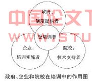 职业院校处于企业和学生的中间地位。院校与学生之间没有雇用与被雇佣的关系,是学生职业成长的帮助者、指导者和组织者。根据经济社会发展的需要、企业的具体要求和学生的个性特征,职业院校通过开展的培训教育活动,使学生养成高尚的职业道德,获取必要的职业知识,掌握娴熟的职业技能,适应职业活动的需要。职业院校的最大优势在于熟悉职业培训与教育规律,能够主导教育培训过程,以科学的培训和教育方法取得良好的效果。职业院校的价值体现在受培训和教育者职业能力的提高上,而职业能力的提高反映在岗位工作效率和工作质量的改善以及薪酬水平提高等方面。