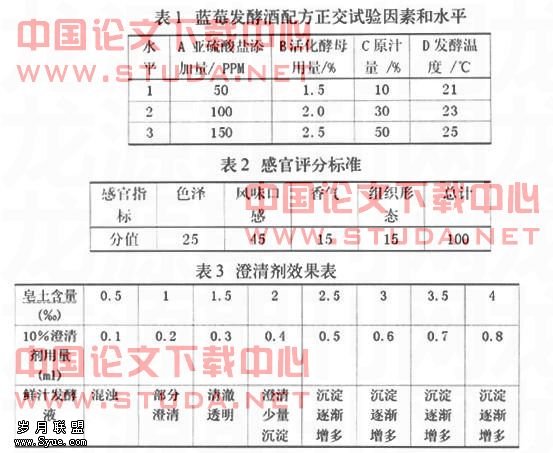 本文采用发酵法生产蓝莓果酒经正交试验确定出最佳配方及生产工艺,最后生产出风味纯正,酒体丰满,清澈亮丽且具有保健功效的发酵型蓝莓果酒。