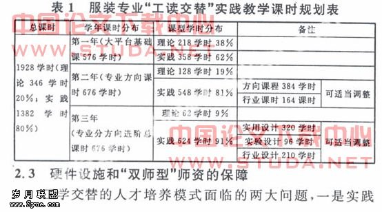 (2)课程体系总规划:根据工学交替模式人才培养的课程体系构建总体思路,先设置课程,再分配学时。课程设置分为几个环节。在总体思路上实行“共同技能平台+小专门化方向进阶”,逐步实现统筹的“大专业平台,小专业方向进阶”分流教学,组建核心能力课程群。①设置大平台的专门化课程体系。大专业平台下的“工学交替”实践教学课程结构,大专业平台课程就是国家行业准入的上岗技能证的获得的需要。比如服装制版师、服装缝纫工、服装设计师,都分初级、中级、高级。②大平台方向课程和专业分方向进阶课程建设。这里的平台方向课程指为服装专业的专项核心技能,也就是职业技能岗位普遍需要了解并掌握的能力而设置的课程。当学生完成大平台基础课程教学后,进入第二平台教学——平台方向课,进行服装专业专项综合能力的培养和提高。在这一阶段实践课程中,主要有两大概念课题需要实施,一是实用课程综合实践,主要是项目实用技能的训练;二是行业实习,是为了课程内容实际运用能力的提升和分方向进阶的需要。其带有研究性质的项目实践,主要目标是挖掘“创新思维”。分方向进阶课程完全进入工作室,在真实的工作室环境中完成所有教学任务。这一阶段更加注重教学实践,运用实际项目,着重培养学生的“完成能力”。③该模式的课程课时规划也要做相应调整。以服装设计与制作工艺专业课程为例,第一年(基础理论与技能课程):必修课(应用文写作、、马哲、绘画基础、服装史,服装设计、服装结构、制作工艺,选修课(企业文化、字体设计、手工工艺、款式平面图绘制);第二年(专业方向课程设置):必修课(服装结构、服装设计、服装工艺、服装材料、服装机械、服装企业管理、服装营销与外贸、行业实习);选修课(立体裁剪、社交礼仪、外贸英语等);第三年(方向进阶课程设置),必修课(实训、服装结构、服装工艺、服装设计、毕业设计,行业实习),选修课(国画、绘画、高级制作工艺、高级服装制版等)。该模式学制为3年:将每一学年分为3个学期,其中前两学期在校进行理论知识学习,第三学期在企业集中实践或顶岗工作。该模式具有3个特征:一是上学交替进行;二是两个长学期集中理论学习,其间可根据需要组织实践;三是每学年两个长学期一般分别授课约1928周,短学期一般实践4~8周,其实践学时或学分所占总学时或学分的比例大约为35%~50%,该模式适用于应用性、操作性不很强的专业。具体课时分配见表1。