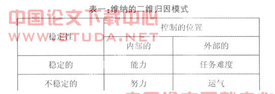 归因是指人们对自己或他人的活动及其结果以及其他社会事件的原因做出的解释或推论。研究归因的理论很多。其中维纳(1974)的归因理论影响最大。维纳将成就任务时的成功和失败归因于四个原因:能力、努力、任务难度和运气。并用稳定性和控制的位置两个维度划分(表1)。