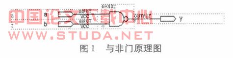 项目设计遵循的第三点是将基本知识与设计技能有机结合。在教学的不同阶段,完成不同基础知识与VHDL程序设计方法的项目教学。如在介绍VHDL最基本知识的项目中,可借助学生过去学过的数字电路知识,使用电路原理图的方法程序设计。如下图所示: