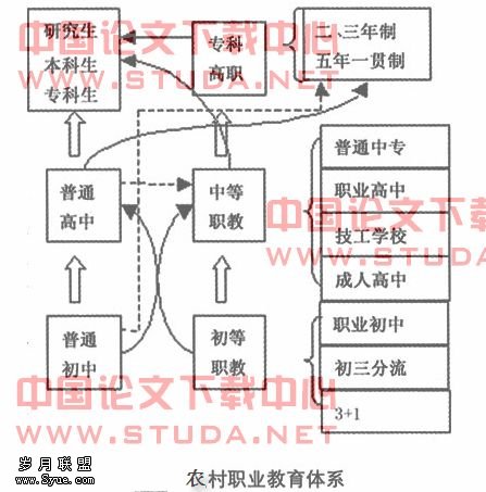 研究和解决农村职业教育问题,要从农民、农村、农业发展的实际要求出发,尊重农村社会和职业教育发展的特点和。图1 农村职业教育体系农村职业教育承担着农民学历教育+农民短期培训两大任务,学历教育主要是为农村培养新型农民和农村剩余劳动力长期转移到城市服务,而短期培训主要为农村剩余劳动力转移的务工和下岗后转岗再培训服务。因此,新时期农村职业教育改革的方向是,把握农村经济和社会发展的脉搏,从农村剩余劳动力转移和社会主义新农村建设的实际需要出发,确定教育目标,设计教育模式,规划教育未来,逐步构建布局合理、结构有序、辐射面广、示范性强、上下贯通、左右衔接、机制灵活开放的农村职业教育体系如图1的所示。